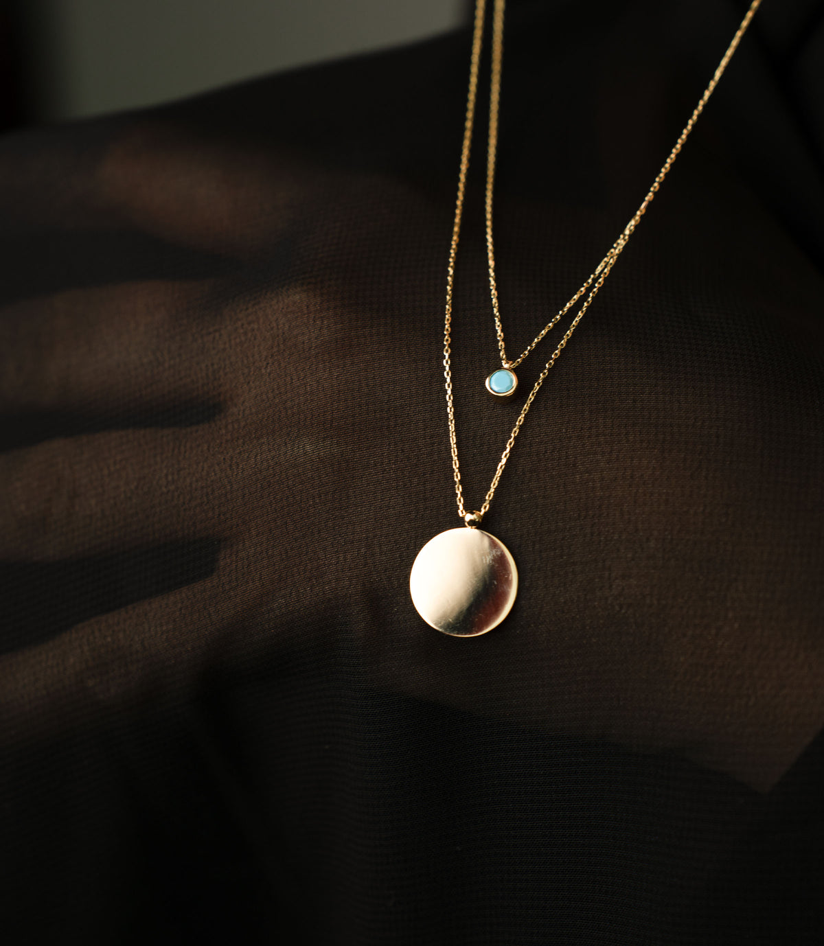 Die obere Kette ist mit einem funkelnden blauen Zirkonia-Stein in edler Goldfassung verziert, während die untere Kette eine schlichte, polierte Goldplatte trägt. Diese kann auf Wunsch graviert werden und macht das Schmuckstück zu einem ganz persönlichen Begleiter.