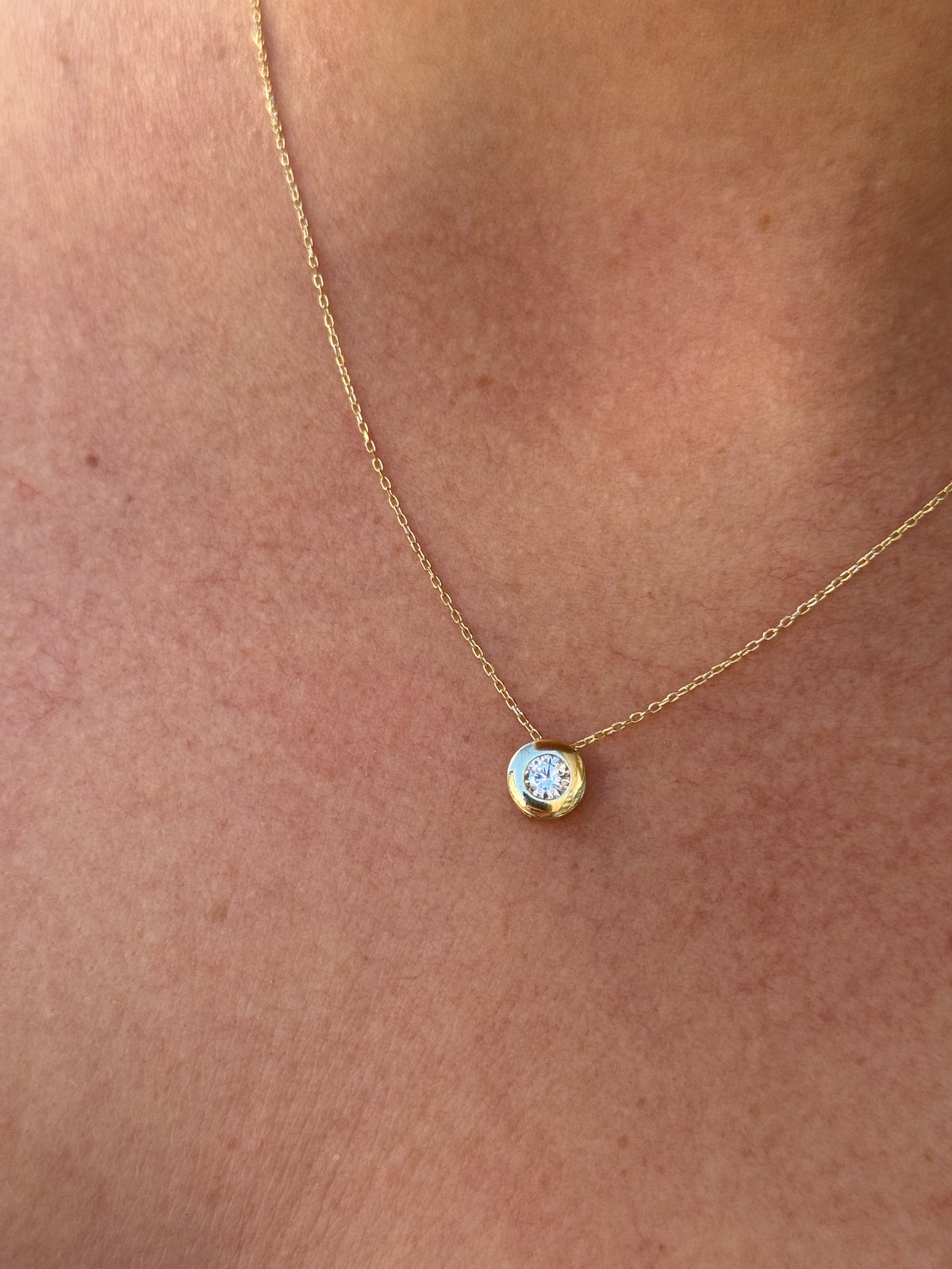 Der fein gearbeitete Anhänger trägt einen runden Zirkonia im Brillantschliff – eingefasst in einer modernen Zargenfassung, die das Licht auf elegante Weise reflektiert.