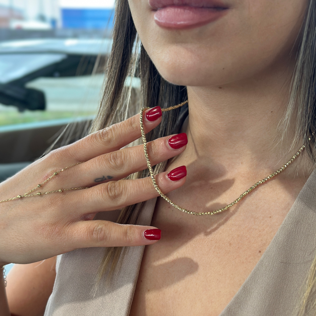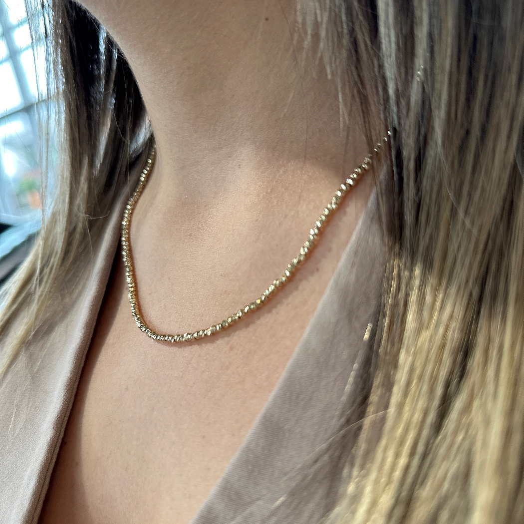Die Dorika Kette aus 585er Echtgold verkörpert schlichte Eleganz und funkelnde Raffinesse. Ihre diamantgeschliffenen Kügelchen reflektieren bei jeder Bewegung das Licht und erzeugen ein edles, zeitloses Funkeln.