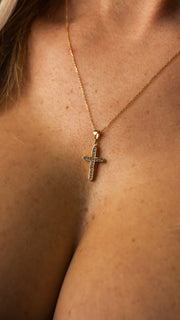 Die zarte Goldkette ergänzt das Design harmonisch und liegt angenehm auf der Haut. Durch ihre schlichte Form eignet sich die Kette ideal für den Alltag, lässt sich aber ebenso stilvoll zu besonderen Anlässen tragen. Das Kreuz steht als Symbol für Glauben, Schutz und Stärke und macht dieses Schmuckstück zu einem bedeutungsvollen Begleiter.