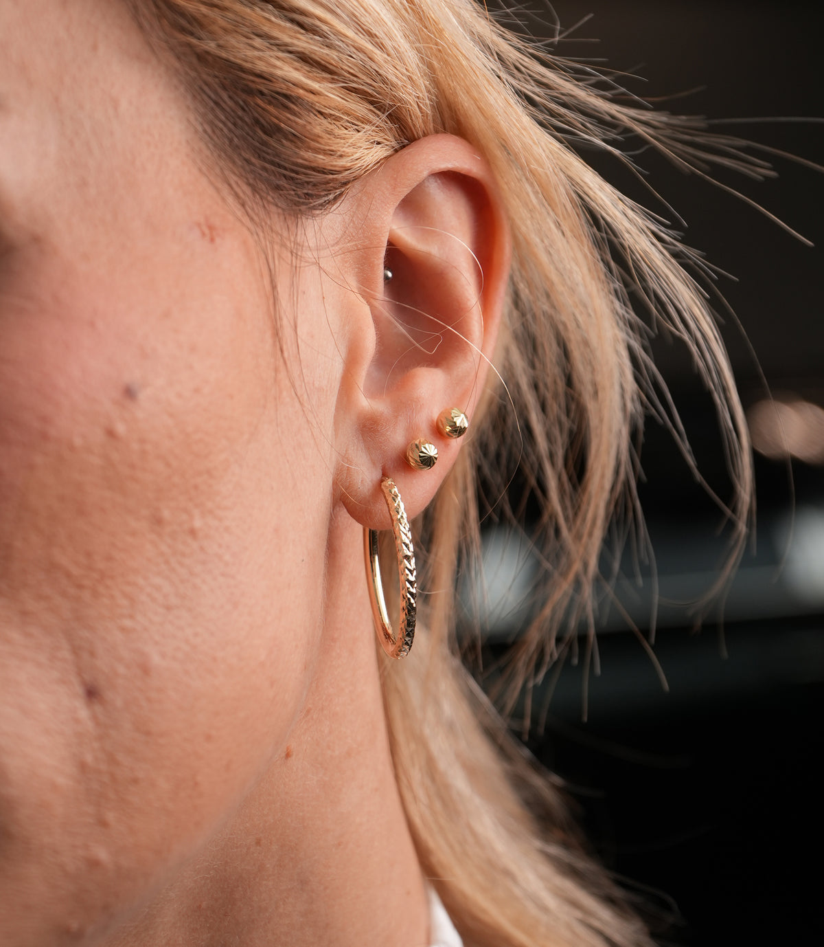 Die Rückseite ist poliert und besticht durch ihre glatte, spiegelnde Oberfläche – ein zeitloser Kontrast, der das Design abrundet. Dank der sorgfältigen Verarbeitung und des robusten Materials bieten die Creolen neben Schönheit auch Langlebigkeit und hohen Tragekomfort.