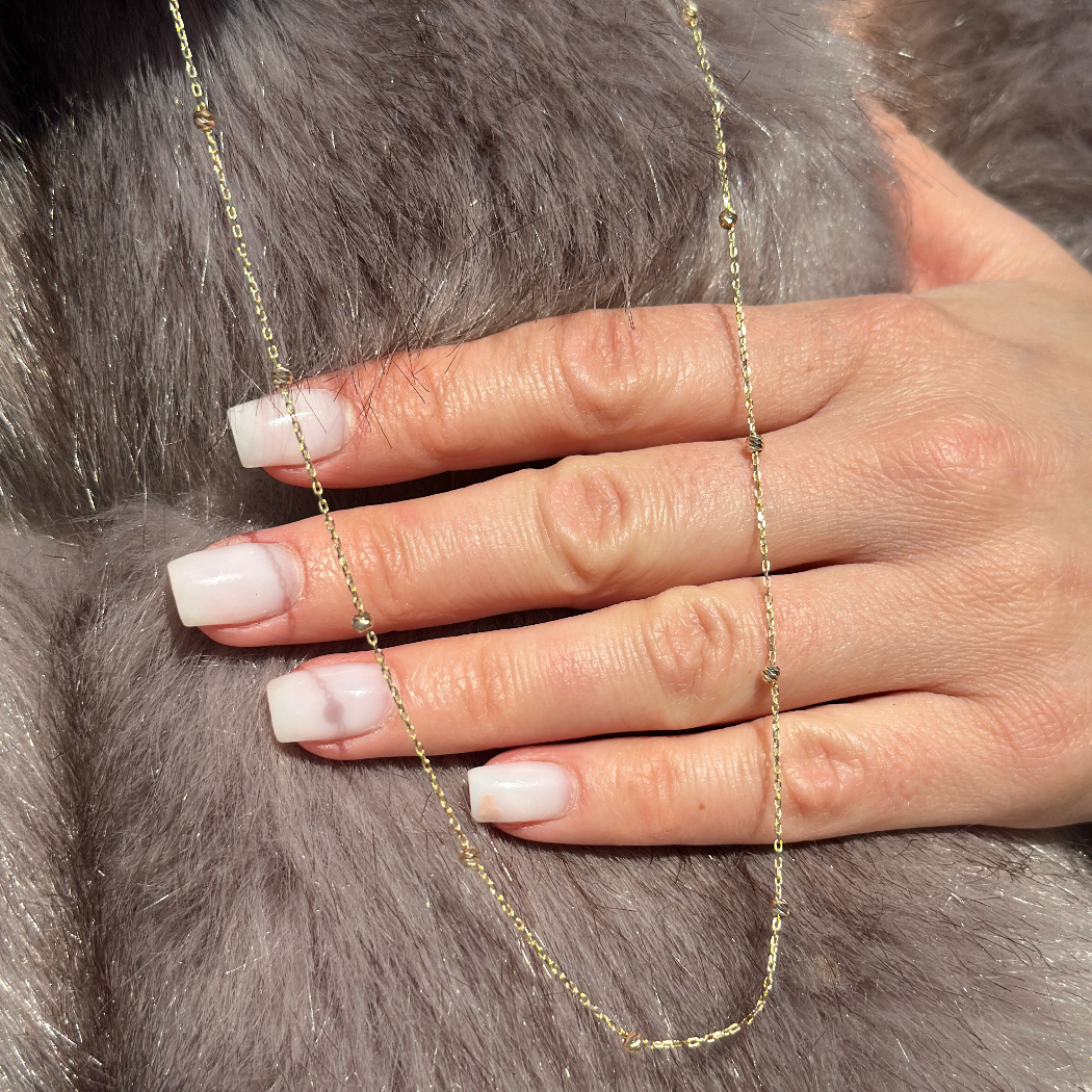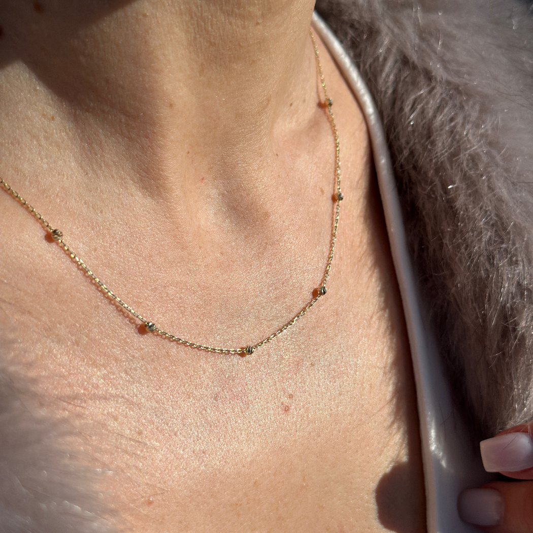 Die Dorika Filigran Kette aus 585er Gold vereint minimalistisches Design mit eleganten Details. Die feine Gliederkette ist mit kleinen, gleichmäßig platzierten Dorika-Kügelchen verziert, die ihr eine zarte Struktur und einen Hauch von Raffinesse verleihen.