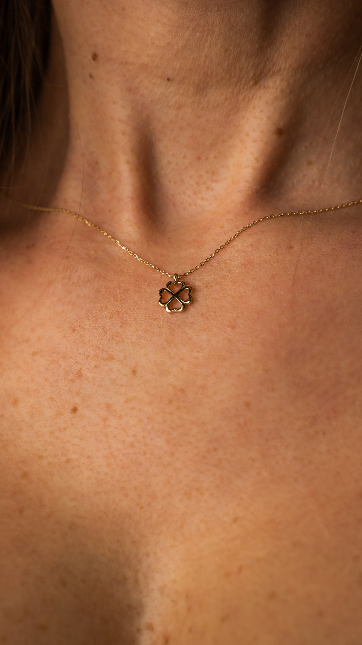Diese filigrane Halskette aus 585er Gold überzeugt durch ihr zeitloses und symbolisches Design. Im Mittelpunkt steht ein zartes, vierblättriges Kleeblatt, das offen gearbeitet und glatt poliert ist. Die klare Form und die feinen Konturen verleihen dem Anhänger eine elegante Leichtigkeit und machen ihn zu einem dezenten Blickfang.