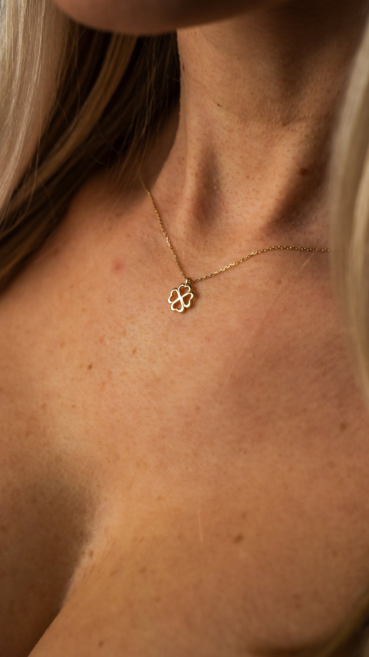 Die feine Goldkette ergänzt das Kleeblatt harmonisch und liegt angenehm auf der Haut. Durch ihr schlichtes Design eignet sich die Kette ideal für den Alltag, lässt sich aber ebenso stilvoll zu besonderen Anlässen tragen. Das Kleeblatt steht symbolisch für Glück, Schutz und positive Energie und macht dieses Schmuckstück zu einem besonderen Begleiter oder Geschenk.